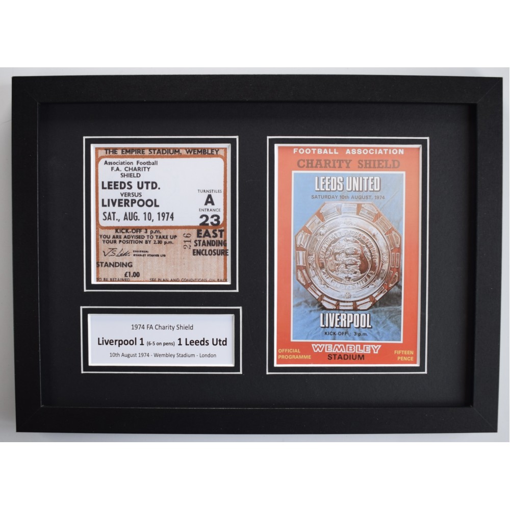 A4 photo mount ticket display framed - 1974 FA Charity Shield, Liverpool v Leeds Utd, Liverpool win on penalties