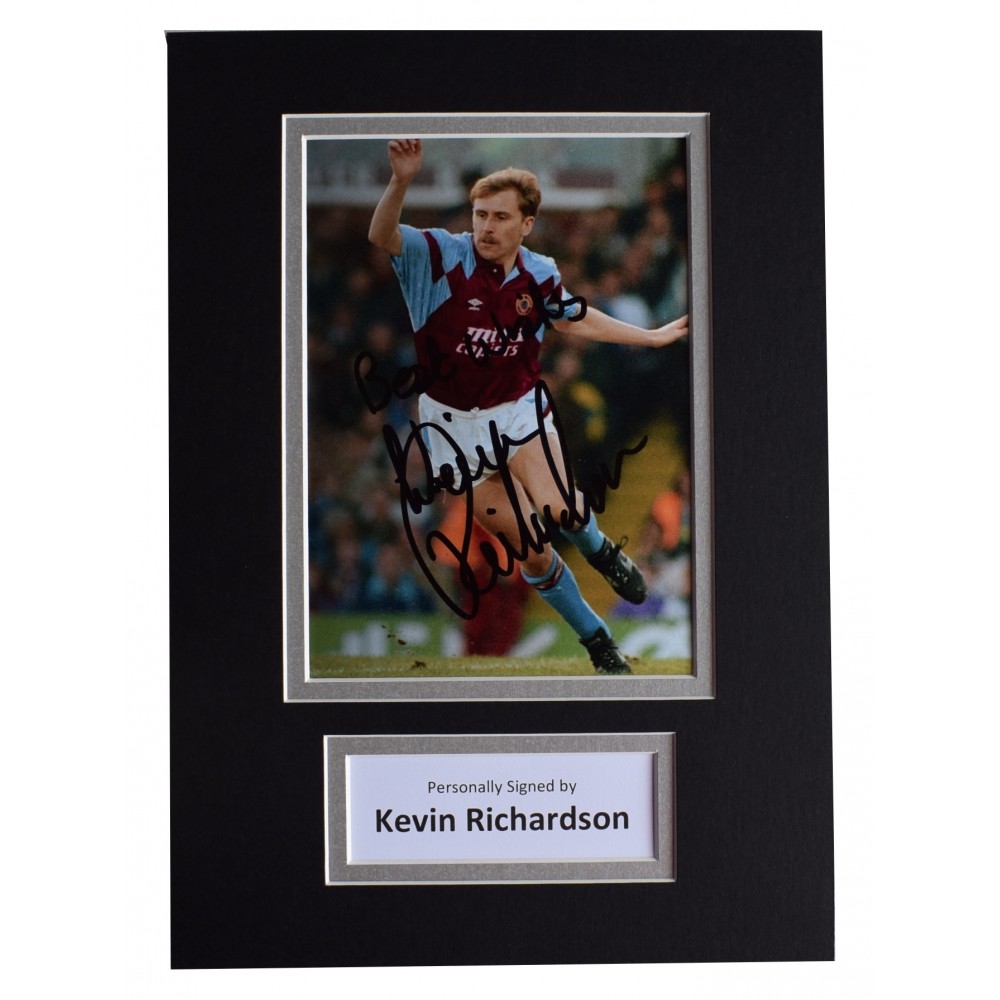 You are looking at a high quality, professionally mounted A4 size photo display which has been personally signed by Aston Villa legend, Kevin Richardson. This is a perfect affordable gift idea. The 7x5 inch photo has been signed and mounted making the overall display A4 in size (same size as a standard sheet of paper), which is a standard size for a frame that can be bought from most supermarkets or high street stores. We use top quality double mount board (matting) that compliments the signed photo within and has been professionally cut using a state of the art laser cutter - a perfect piece of memorabilia and a fantastic gift. If you require any further information please contact us.