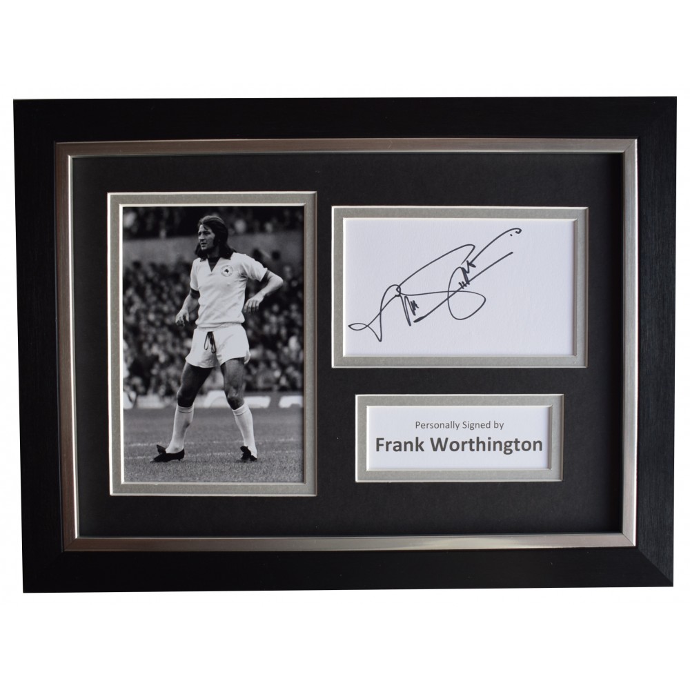 You are looking at a high quality, professionally FRAMED & mounted photo display which has been personally signed by Leicester City legend, Frank Worthington. The white card has been signed and is complimented with a 6x4 inch photograph and then housed within a double mount that compliments the quality black frame making it an A4 size overall framed display (same size as a standard piece of A4 paper - approx 21x30cm). This is ready to be hung straight on the wall or can also be free standing- a really impressive piece of memorabilia that would make a perfect affordable gift for someone special.