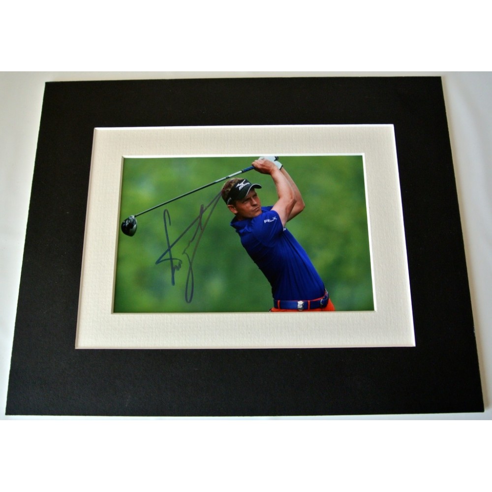 You are looking at a high quality, professionally mounted 10x8 inch photo display which has been personally signed by golfer, Luke Donald . This is a perfect affordable gift idea, the overall measurement is 10x8 inches (signed photo is 6x4 inches), which is a standard size for a frame that can be bought from most supermarkets or high street stores. We use top quality double mount board (matting) that compliments the signed photo within and has been professionally cut using a state of the art laser cutter - a perfect piece of memorabilia and a fantastic gift.