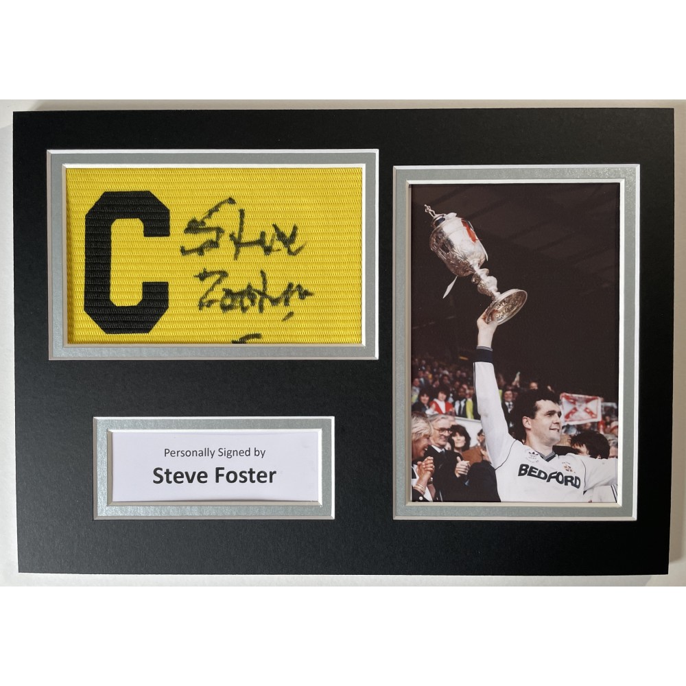 Signed by Luton Town legend, Steve Foster - an A4 captains armband & photo mount autograph display.