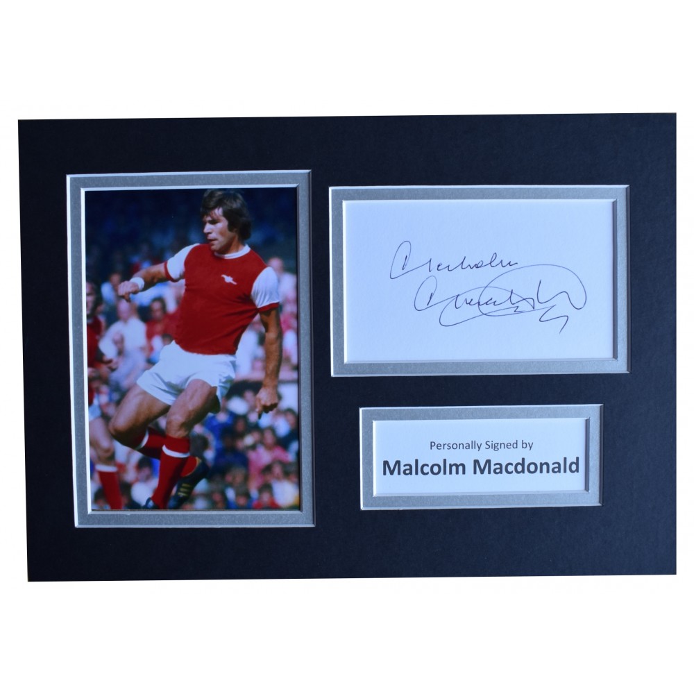You are looking at a high quality, professionally mounted A4 size photo display which has been personally signed by Arsenal legend, Malcolm Macdonald. This is a perfect affordable gift idea. The white card has been signed and is complimented with a 6x4 inch photo making the overall display A4 in size (same size as a standard sheet of paper), which is a standard size for a frame that can be bought from most supermarkets or high street stores. We use top quality double mount board (matting) that compliments the signed photo within and has been professionally cut using a state of the art laser cutter - a perfect piece of memorabilia and a fantastic gift.