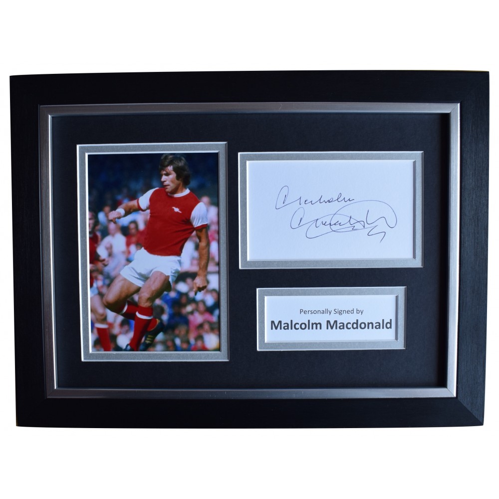 You are looking at a high quality, professionally FRAMED & mounted photo display which has been personally signed by legendary Arsenal footballer, Malcolm Macdonald. The white card has been signed & complimented with a replica programme photgraph and then housed within a double mount that compliments the quality black & silver frame making it an A4 size overall framed display (same size as a standard piece of A4 paper - approx 21x30cm). This is ready to be hung straight on the wall or can also be free standing- a really impressive piece of memorabilia that would make a perfect affordable gift for someone special.