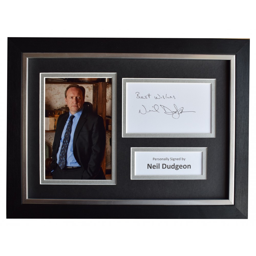 You are looking at a high quality, professionally FRAMED & mounted photo display which has been personally signed by actor, Neil Dudgeon.  The white card has been signed and is complimented with a 6x4 inch photograph and then housed within a double mount that compliments the quality black frame making it an A4 size overall framed display (same size as a standard piece of A4 paper - approx 21x30cm). This is ready to be hung straight on the wall or can also be free standing- a really impressive piece of memorabilia that would make a perfect affordable gift for someone special.