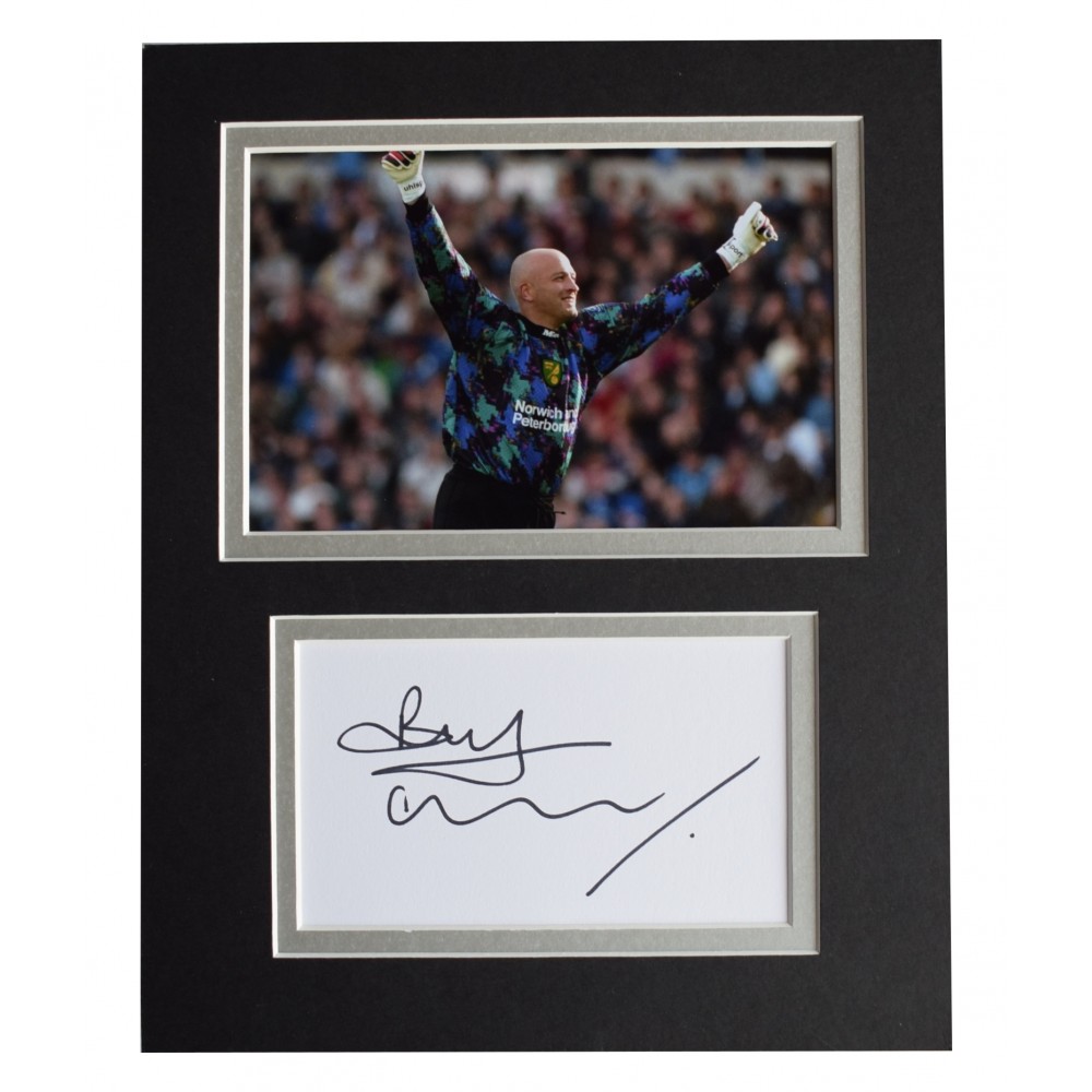 You are looking at a high quality, professionally mounted 10x8 inch photo display which has been personally signed by Norwich City legend, Bryan Gunn. This is a perfect affordable gift idea. The white card has been signed & complimented with a 6x4 inch photograph & then housed within a double mount making it an overall size of 10x8 inches, which is a standard size for a frame that can be bought from most supermarkets or high street stores. We use top quality double mount board (matting) that compliments the signed photo within and has been professionally cut using a state of the art laser cutter - a perfect piece of memorabilia and a fantastic gift. If you require any further information please contact us.