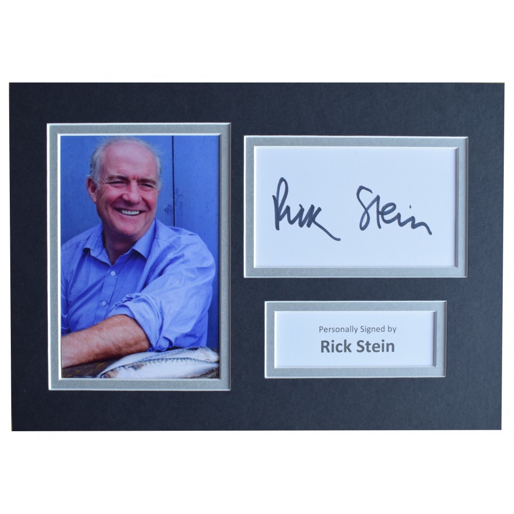You are looking at a high quality, professionally mounted A4 size photo display which has been personally signed by TV chef, Rick Stein. This is a perfect affordable gift idea. The white card has been signed and is complimented with a 6x4 inch photo making the overall display A4 in size (same size as a standard sheet of paper), which is a standard size for a frame that can be bought from most supermarkets or high street stores. We use top quality double mount board (matting) that compliments the signed photo within and has been professionally cut using a state of the art laser cutter - a perfect piece of memorabilia and a fantastic gift.