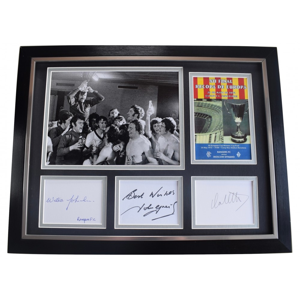 Signed by all 3 Rangers legends, John Greig, Willie Johnston & Colin Stein - a 16x12 inch Framed Photo Mount Autograph Display.