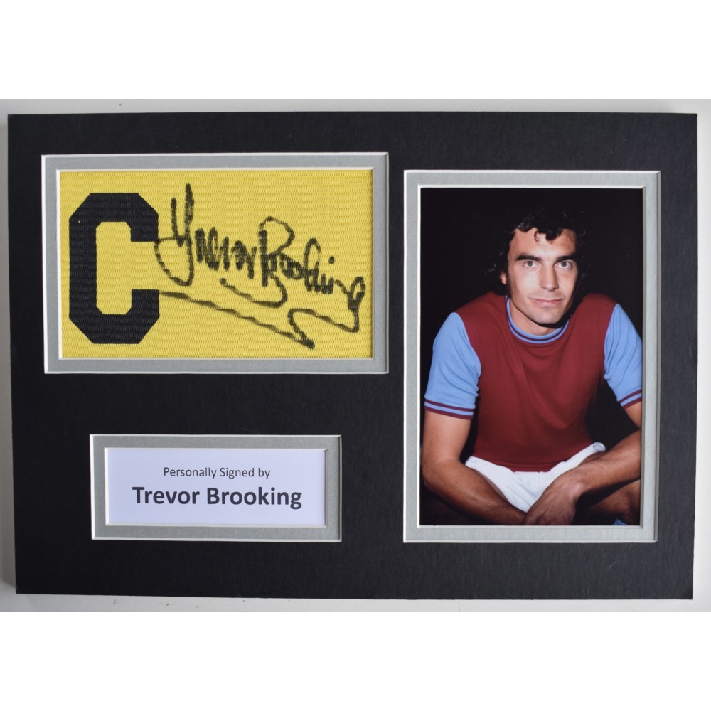 A4 captains armband & photo mount display personally signed by West ham United legend, Sir Trevor Brooking