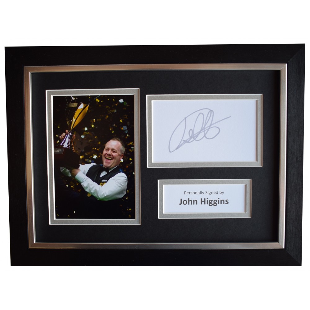 You are looking at a high quality, professionally FRAMED & mounted photo display which has been personally signed by snooker champion, John Higgins. The white card has been signed and is complimented with a 6x4 inch photograph and then housed within a double mount that compliments the quality black frame making it an A4 size overall framed display (same size as a standard piece of A4 paper - approx 21x30cm). This is ready to be hung straight on the wall or can also be free standing- a really impressive piece of memorabilia that would make a perfect affordable gift for someone special.