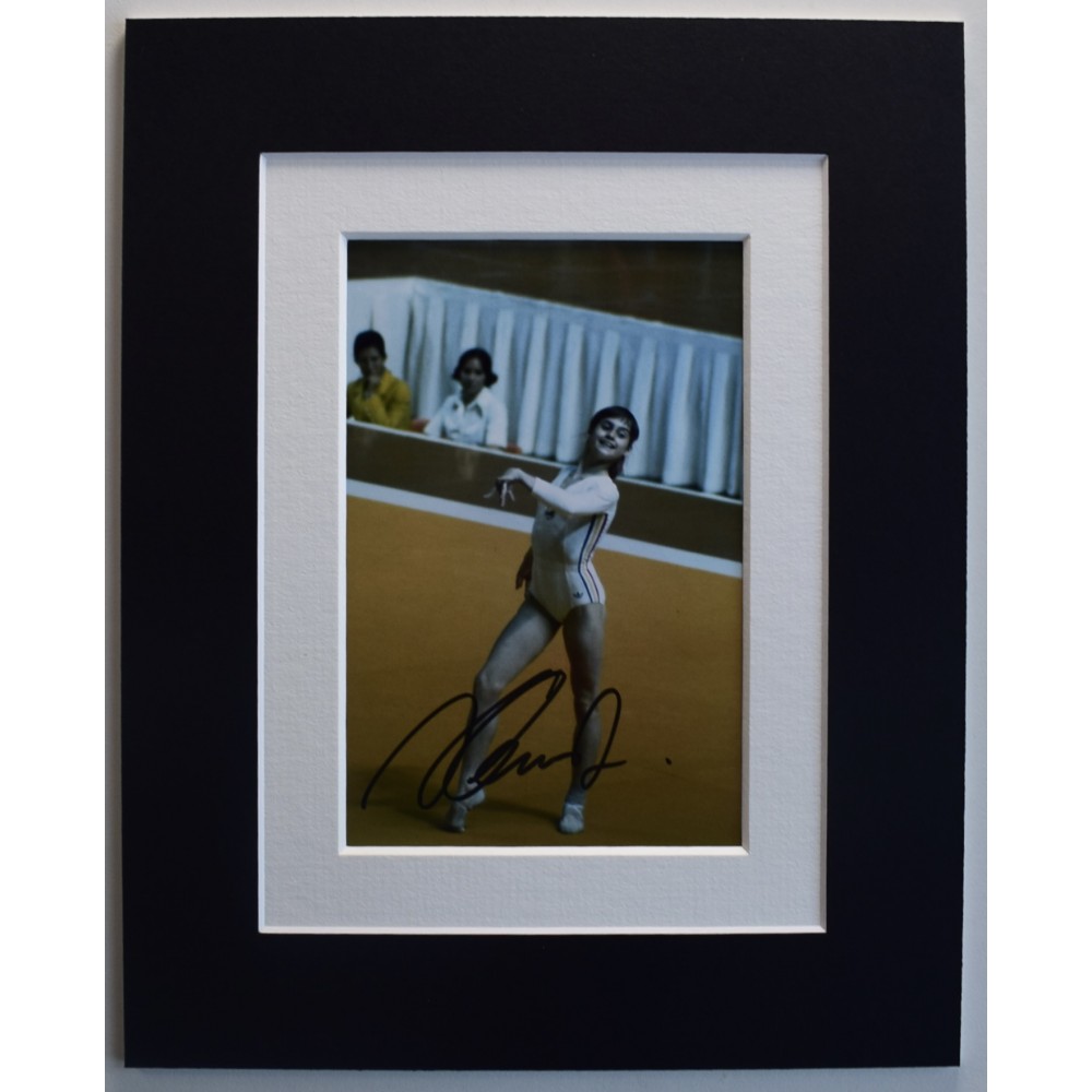A 10x8 mounted photo display, signed by olympic gymnast, Nadia Comaneci