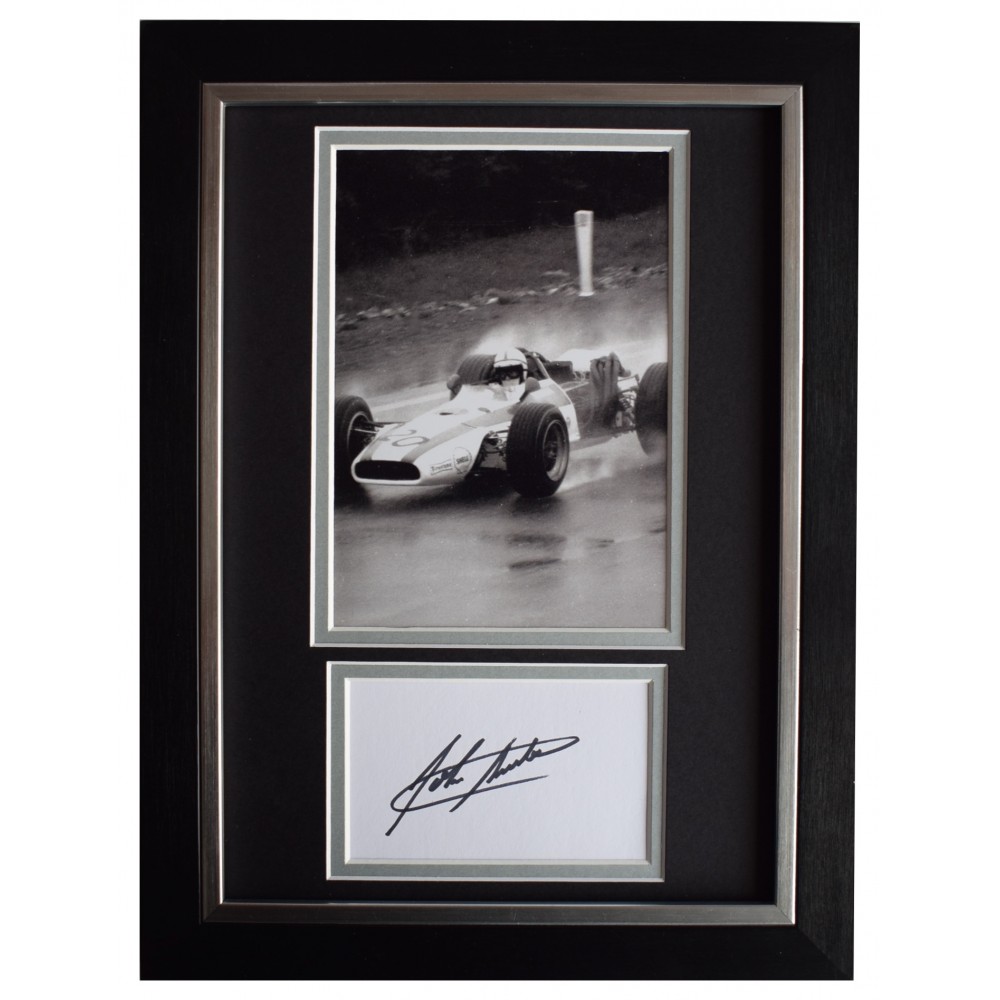 An A4 framed photo mount display personally signed by F1 motor racing legend, John Surtees