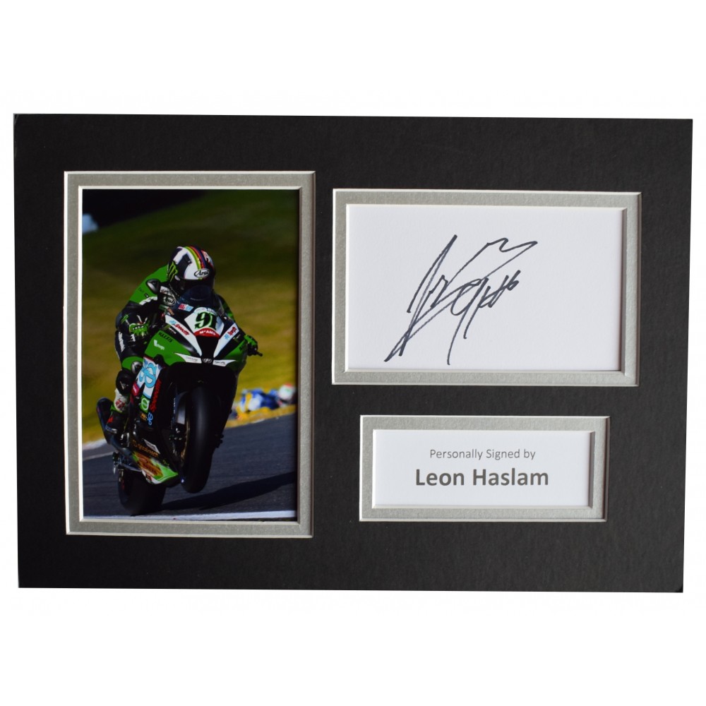 You are looking at a high quality, professionally mounted A4 size photo display which has been personally signed by Superbikes racer, Leon Haslam. This is a perfect affordable gift idea. The white card has been signed and is complimented with a 6x4 inch photo making the overall display A4 in size (same size as a standard sheet of paper), which is a standard size for a frame that can be bought from most supermarkets or high street stores. We use top quality double mount board (matting) that compliments the signed photo within and has been professionally cut using a state of the art laser cutter - a perfect piece of memorabilia and a fantastic gift.