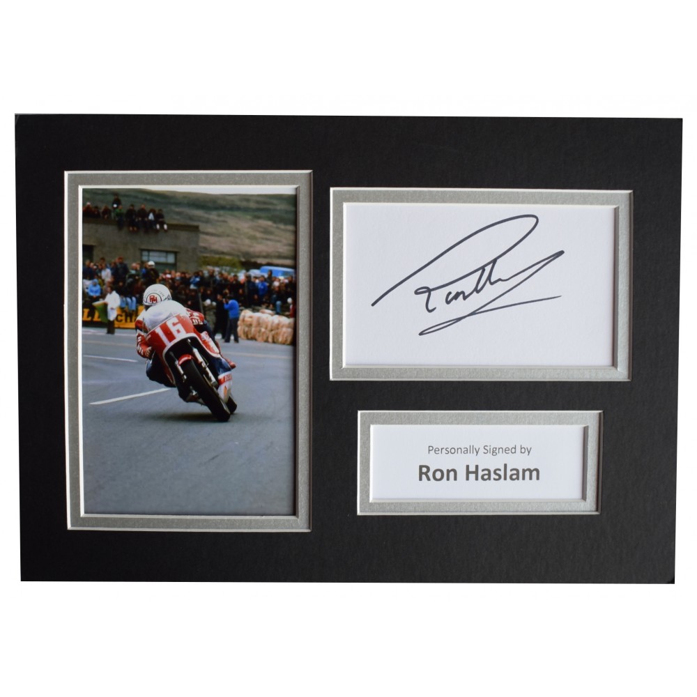 You are looking at a high quality, professionally mounted A4 size photo display which has been personally signed by Superbikes racer, Ron Haslam. This is a perfect affordable gift idea. The white card has been signed and is complimented with a 6x4 inch photo making the overall display A4 in size (same size as a standard sheet of paper), which is a standard size for a frame that can be bought from most supermarkets or high street stores. We use top quality double mount board (matting) that compliments the signed photo within and has been professionally cut using a state of the art laser cutter - a perfect piece of memorabilia and a fantastic gift.