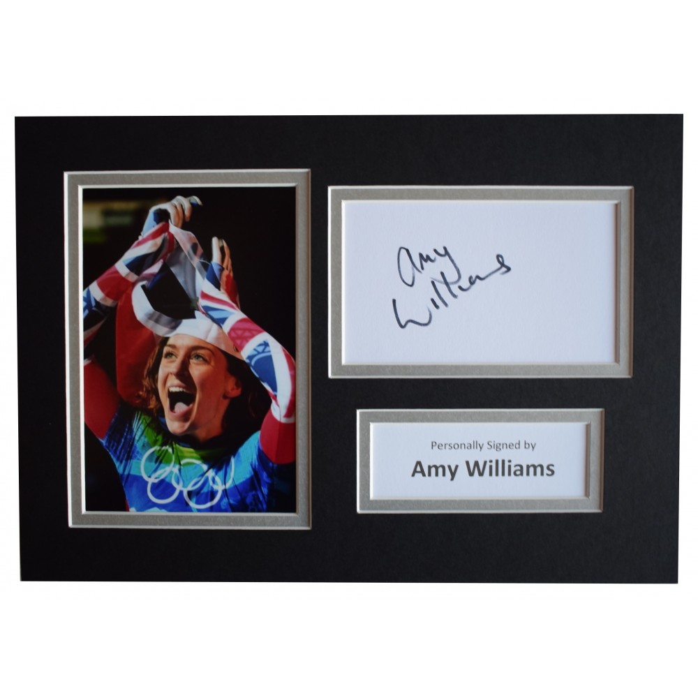 You are looking at a high quality, professionally mounted A4 size photo display which has been personally signed by Olympic skeleton champion, Amy Williams. This is a perfect affordable gift idea. The white card has been signed and is complimented with a 6x4 inch photo making the overall display A4 in size (same size as a standard sheet of paper), which is a standard size for a frame that can be bought from most supermarkets or high street stores. We use top quality double mount board (matting) that compliments the signed photo within and has been professionally cut using a state of the art laser cutter - a perfect piece of memorabilia and a fantastic gift.