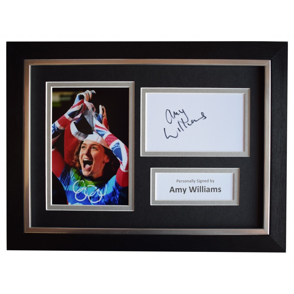 You are looking at a high quality, professionally FRAMED & mounted photo display which has been personally signed by Olympic skeleton champion, Amy Williams.  The white card has been signed and is complimented with a 6x4 inch photograph and then housed within a double mount that compliments the quality black frame making it an A4 size overall framed display (same size as a standard piece of A4 paper - approx 21x30cm). This is ready to be hung straight on the wall or can also be free standing- a really impressive piece of memorabilia that would make a perfect affordable gift for someone special.