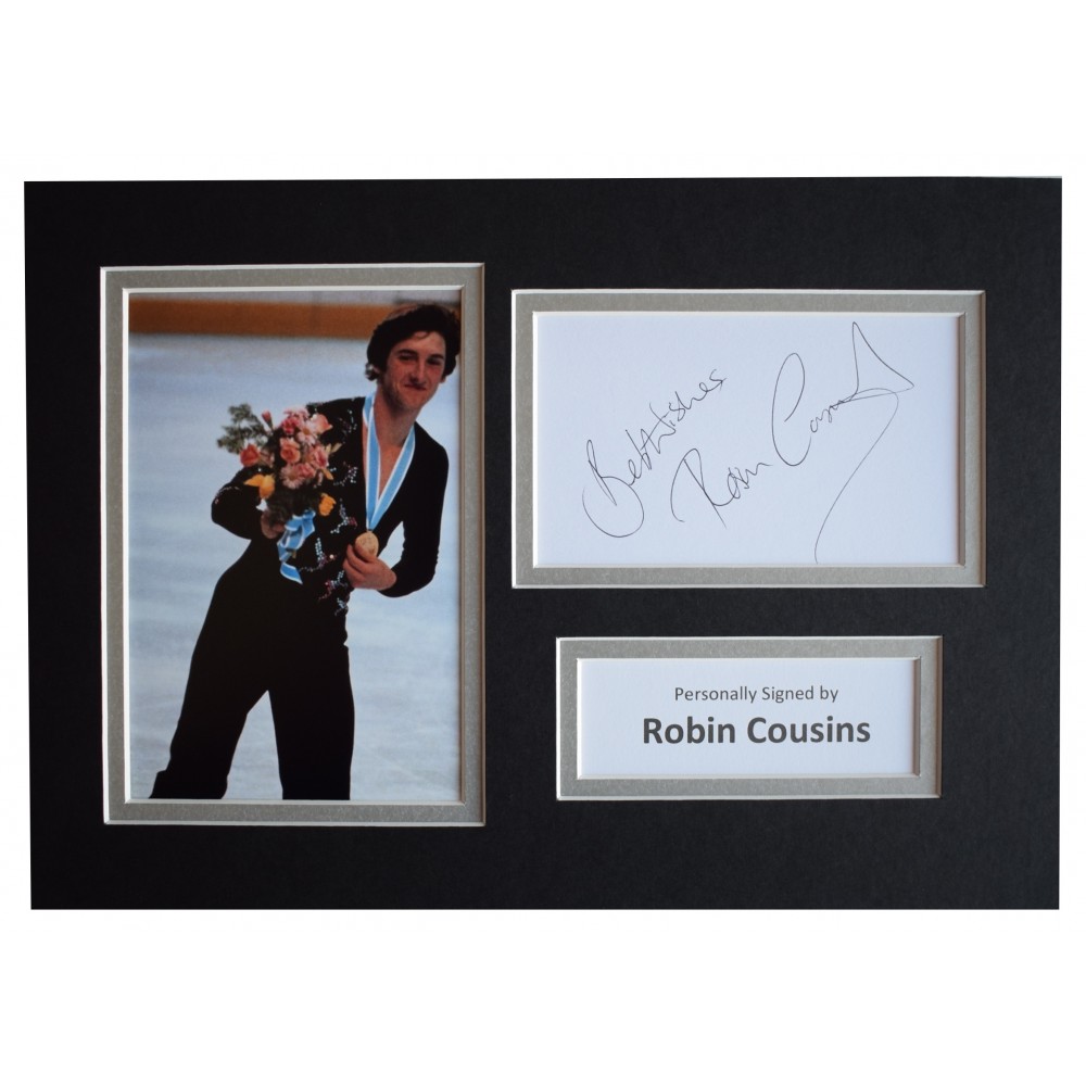 You are looking at a high quality, professionally mounted A4 size photo display which has been personally signed by Olympic skating champion, Robin Cousins. This is a perfect affordable gift idea. The white card has been signed and is complimented with a 6x4 inch photo making the overall display A4 in size (same size as a standard sheet of paper), which is a standard size for a frame that can be bought from most supermarkets or high street stores. We use top quality double mount board (matting) that compliments the signed photo within and has been professionally cut using a state of the art laser cutter - a perfect piece of memorabilia and a fantastic gift.