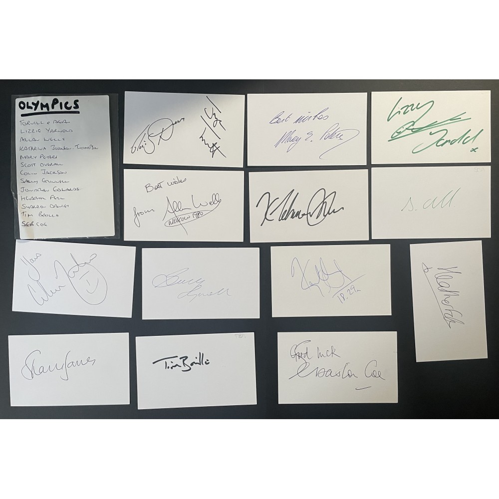 A pack of 13 white index cards, signed by 13 olympic champions, Torvill & Dean, Lizzie Yarnold, Allan Wells, Katarina Johnson Thompson, Mary Peters, Scott Overall, Colin Jackson, Sally Gunnell, Jonathan Edwards, Heather Fell, Sharron Davies, Tim Baille, Sebastian Coe